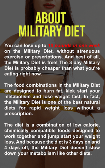 خطة النظام الغذائي العسكري الرائع: خطة فقدان الوزن لمدة 3 أيام هي خطة غذائية منخفضة السعرات الحرارية والدهون والكربوهيدرات تسمح لك بفقدان ما يصل إلى 10 رطل في أسبوع. هذه الخطة السريعة لفقدان الوزن سهلة المتابعة وتسمح لك بتناول الأطعمة التي تحبها.